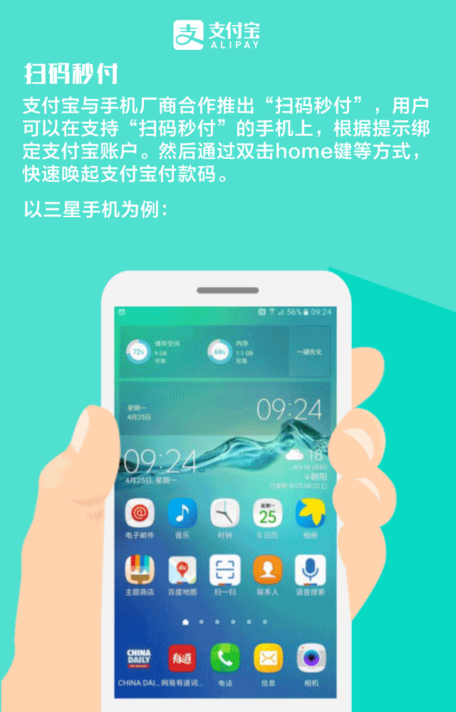 支付宝与手机厂商合作推出了“扫码秒付”,用户在支持“扫码秒付”的手机上,根据提示绑定支付宝帐户,就能通过双击Home键等方式,快速唤起支付宝付款码: