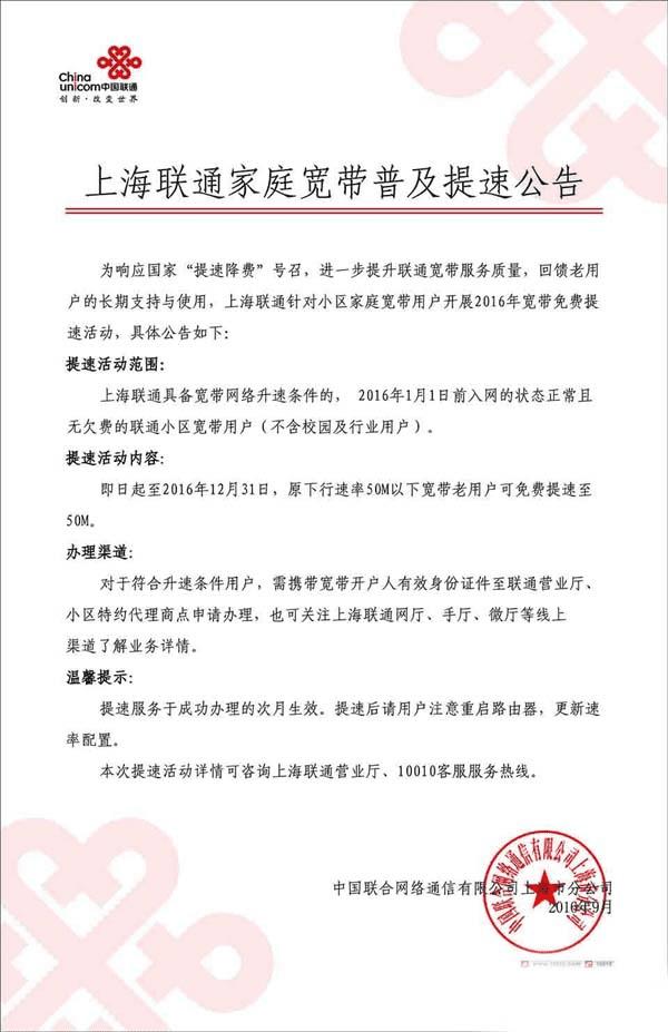 上海联通宣布,凡2016年1月1日前入网状态正常且无欠费的小区宽带用户,自即日起到2016年12月31日,均可申请免费将下行速率提升到50M。