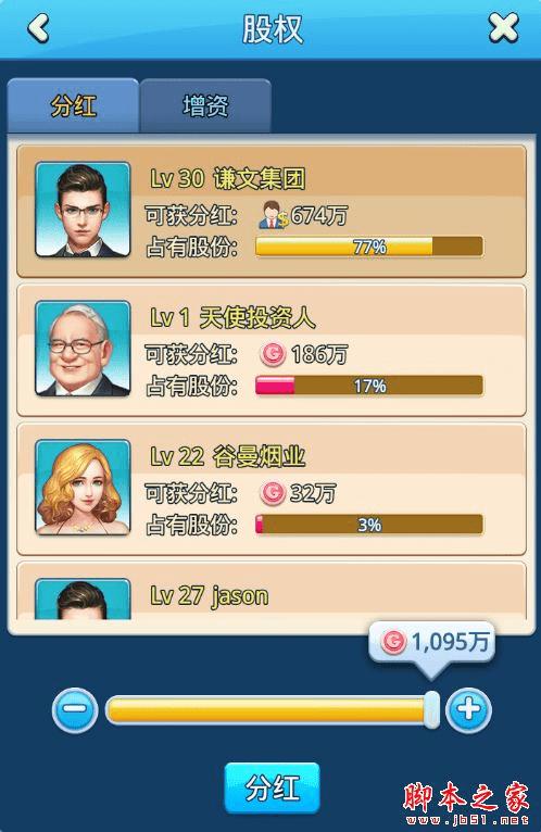 在《大富豪3》通过公司分红可获得个人财富,如果您有投资别家企业,那么个人财富就可以用来增资,稀释其他股东的股权,从而扩大自家的占股。但由于在游戏内增资的信息也将同步给同一企业的其他投资人,如果有其他投资人也发起增资,最后的结果很有可能会大家占股比例维持现状,所以增资需谨慎考虑喔。