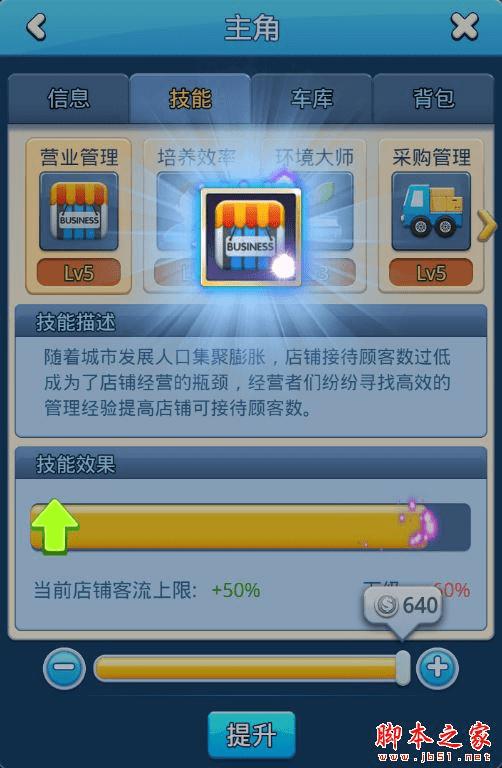 当您遇到升级或发展瓶颈时,可有针对性地升级对眼下发展有利的对应技能项,例如,遇到由于店铺客流上限过低而导致预收入无法拉高时,可以尽可能地让主角学习企业管理技能,提高了客流上限自然预收入也就上去了。