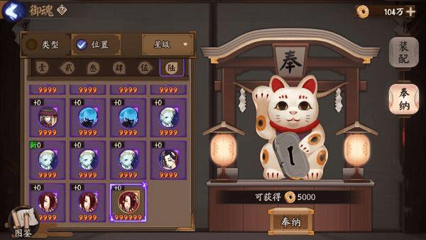 阴阳师御魂奉纳进入方式:打开御魂界面,点击奉纳,可以看到新增的招财猫。把左边的丢进去即可换取金币了。