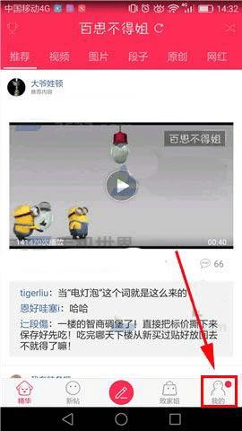 1)首先我们先打开【百思不得姐】的界面,然后再点击右下角的【我的】,打开后接着点击右上角的【图标】。(如下图)