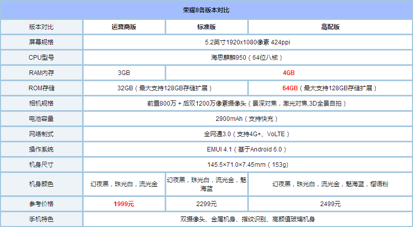 首先看看下面的荣耀8各版本详细参数对比: