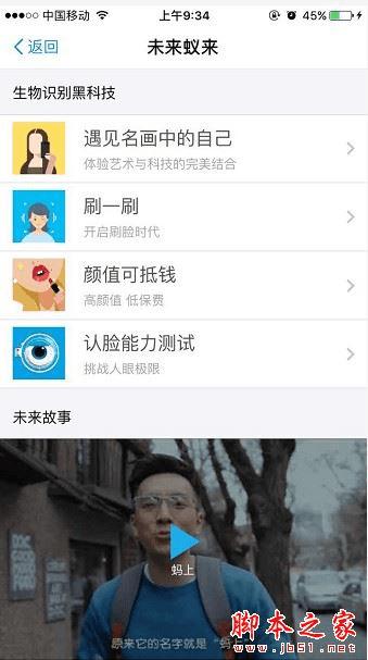 支付宝未来蚁来另外,在“未来蚁来”选项中还加入了“刷脸登陆”功能,“遇见名画中的自己”也是基于支付宝的人脸识别技术支持,系统可在2000多幅人物名画库中找到与自拍照片相似度最高的经典作品中的人物,仅需3秒钟。拍摄要求光线充足、正视手机、不要太快,否则拍摄不能通过。