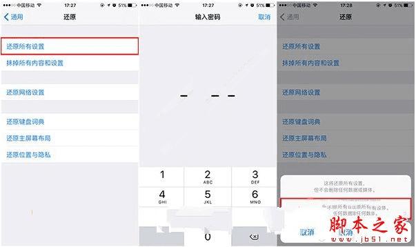 三:点击【还原全部设置】,输入【解锁密码/访问限制密码】,再确认【还原全部设备】即可