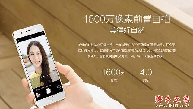 拍照方面,OPPO A59s配备了前置1600万像素和后置1300万像素摄像头,主打自拍,在自拍方面延续了OPPO手机一贯的美颜特性。