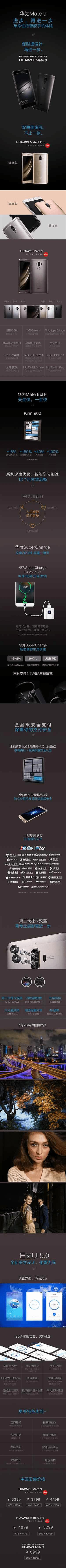 Mate 9 6GB+128GB 4499元、4GB+64GB 3899元、4GB+32GB 3399元。Mate 9 Pro 6GB+128GB 5299元、4GB+64GB 4699元。Mate 9保时捷设计6GB+256GB 8999元。