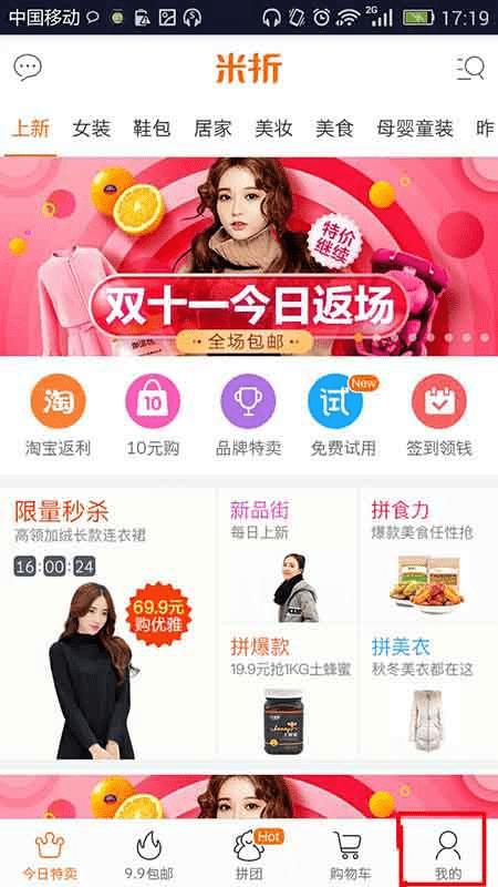 1、下载打开米折app,进入首页,点击右下角”我的“,进入个人中心,点击左上角的设置图标,如下图所示。
