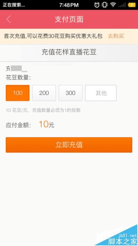 4、点击立即充值就可以了。10元100个花豆,也就是1花豆=0.1元,然后点立即支付;在支付页面可以看到,支付方式也多种,其中使用微信支付或者QQ钱包支付可以享受95折优惠