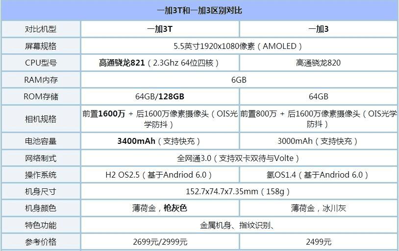 一加3T和一加3的不同之处有?