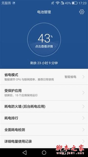 不仅如此,华为在软件层面上同样为畅享6S做了不少省电优化。华为畅享6S运行基于Android6.0深度定制的EMUI 4.1系统,华为专门针对互联网用户研发了超级省电模式,开启此模式后,除电话、短信外,可选择3个APP使用,如微信、QQ等,与此同时,手机的续航能力也会大幅提升。如图:在剩余电量43%的情况下,开启超级省电模式要比智能省电模式续航时间提升15个小时左右,在低电量的情况下用来应急可以说是一个相当不错的选择。