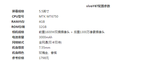 vivoY67硬件配置参数,详情如下所示,参数党必看: