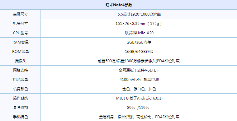 先来看看红米Note4参数配置情况,如下参数表所示。