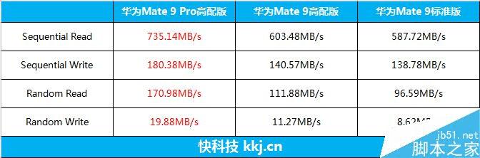 华为Mate 9 Pro在AndroBench 5存储测试中,各项成绩远远超过了华为Mate 9(高配版和标准版),这个成绩已经是当今安卓旗舰的最高水准了。