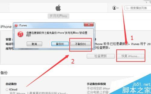 关闭【查找我的iPhone】后,将苹果手机与电脑连接起来,然后打开iTunes,找到【恢复iPhone】按钮并单击它,在弹出的窗口单击选择【不备份】按钮(因为之前一件备份了)。如下图所示。