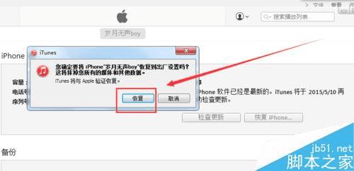 这时候会弹出一个提示窗口,我们单击【恢复】按钮,系统就会将iPhone手机恢复到出厂设置,手机中的数据也会被抹掉。如下图所示。