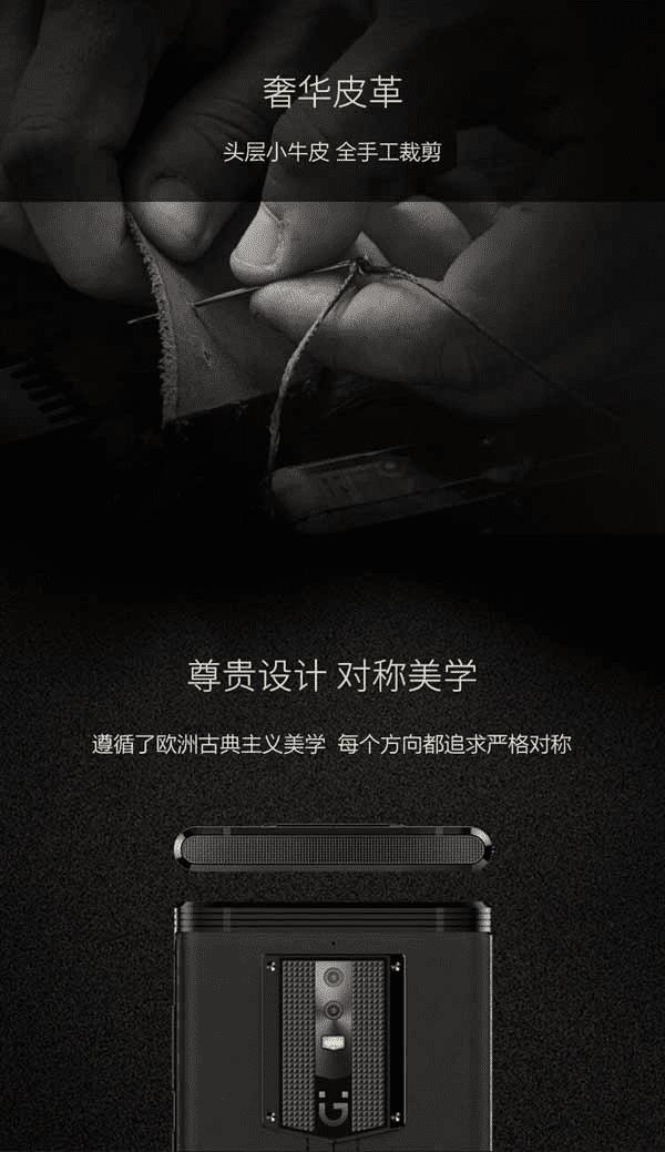 金立M2017采用了铝合金机身设计,背面大面积使用头层小牛皮,全手工裁剪。双摄像头周围采用盾牌造型设计,搭配四角的六角铆钉。
