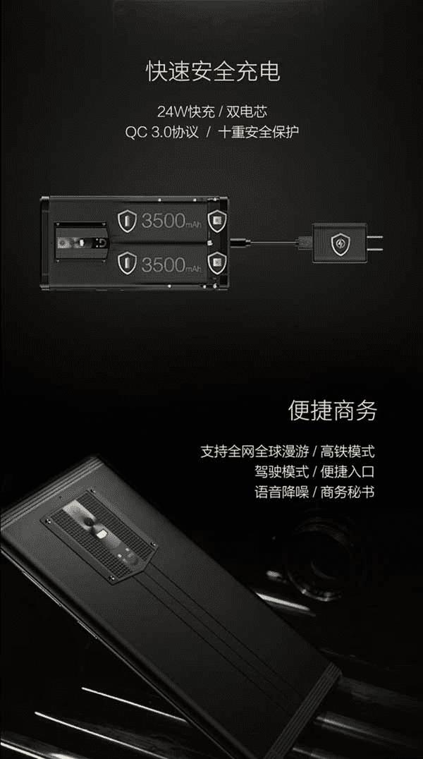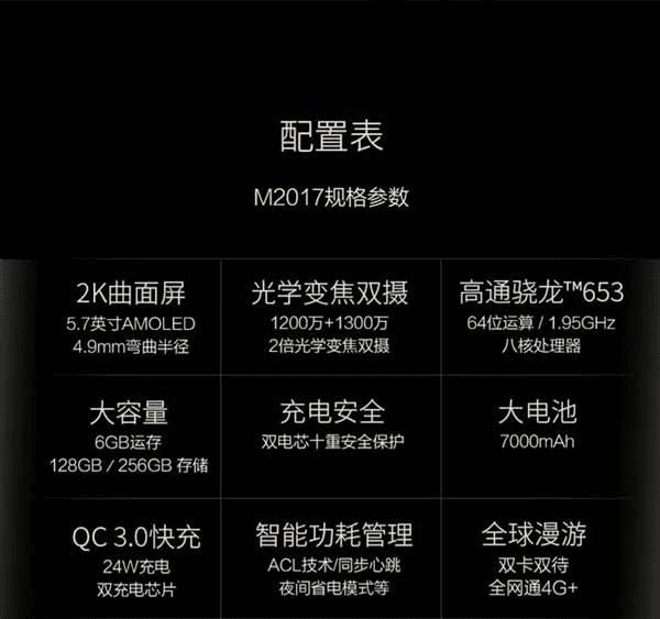 配置方面除了骁龙653处理器偏弱之外都堪称旗舰级别:三星5.7寸2K AMOLED双曲面屏幕、6GB内存、128/256GB存储、后置1200+1300万像素双摄像头、7000mAh电池和24W快充、活体指纹检测、通信/数据/支付三大安全、双卡全球全网通4G+。