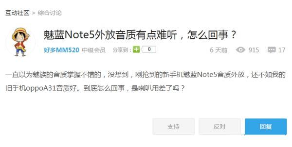 近日,小编收到很多网友,关于魅蓝Note 5的外放音质问题。刚开始小编还以为是批次供货可能出现的硬件问题,也许到下一批次就会解决。而小编去魅族官方论坛一看,发现大部分网友都在反映魅蓝Note5外放音质很差的问题。这样看来,这应该就不是官方硬件故障了,而是本身手机的设计就是如此。