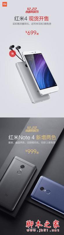 目前仅有64GB版红米Note 4同时拥有雅黑色与幽兰色,售价为1199元,32GB版红米Note 4仅有雅黑色,售价为999元。另外还有金色、银色、灰色可选,均赠送耳机,并可享受花呗3期免息。红米4售价699元起,现在购买赠送活塞耳机,同时可享受花呗3期免息。