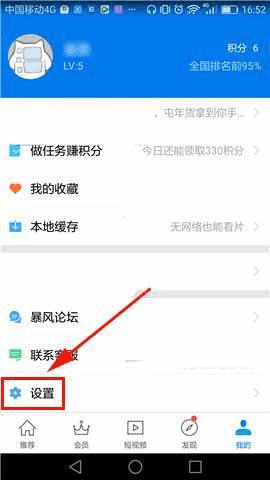 1)来到【手机暴风影音】界面,点击右下角的【我的】,打开后点击【设置】。(如下图)