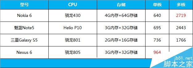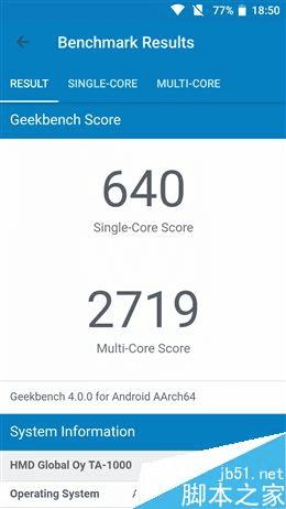 其它配置方面,Nokia 6内置4GB内存+64GB机身存储,最高支持128GB存储卡扩展,接下里我们用测试工具对Nokia 6的性能进行理论性能测试。