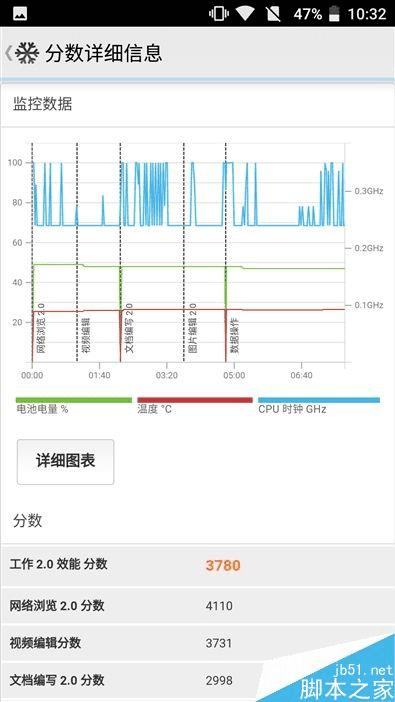 ↑↑↑Nokia 6在PCMark综合效能测试中得分只有3780分,通过右图的监控数据看出,CPU的时钟频率在0.3GHz上下浮动,远没有达到满频1.2GHz的运行状态,只能期待后续的系统优化了。