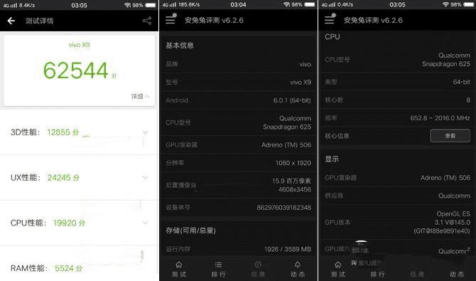 vivo X9采用了5.5英寸1080P全高清屏幕,2.5D弧形玻璃;搭载了高通骁龙625八核64位处理器,拥有4GB RAM和64GB存储空间组合,不支持TF卡扩展;提供一颗2000万像素+1200万像素前置摄像头和一颗1600万像素后置摄像头,支持PDAF相位对焦;电池容3050mAh,支持双引擎闪充技术;运行基于Android 6.0的Funtouch OS 3.0用户界面;支持全网通4G+,支持VoLTE高清语音通话,支持双卡双待;支持指纹识别。