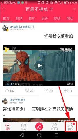 1)首先先打开【百思不得姐】的界面,然后再点击右下角的【我的】,打开后接着点击【月亮】图标。(如下图)