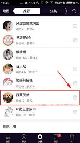 1)我们打开软件点击【小圈】,接着再【点击】进入要关注的小圈。(如下图)