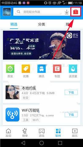 1)首先先打开【应用宝】的界面, 然后再点击右上角的【图标】,打开后接着点击【设置】。(如下图)