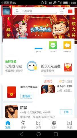 1)首先我们打开【应用宝】的界面,打开后点击左上角的【头像图标】,打开之后接着点击右上角的【图标】。(如下图)