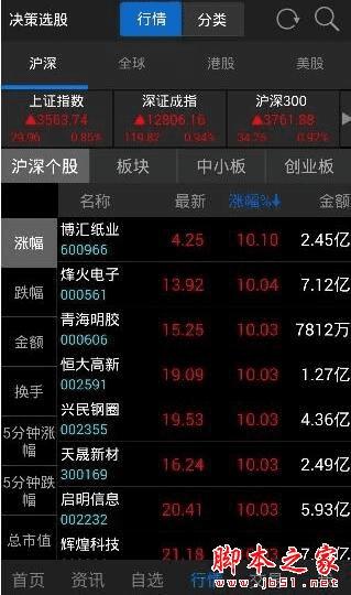 3、在“行情”栏目里,可以看到股市的涨跌行情,如下图: