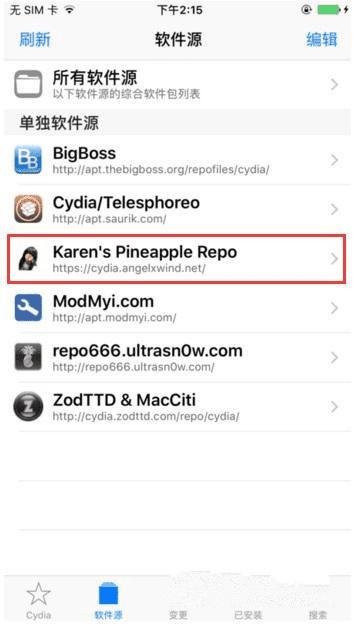 2、添加完成后回到软件源,会看到源“Karen's Pineapple Repo”,点击进入;