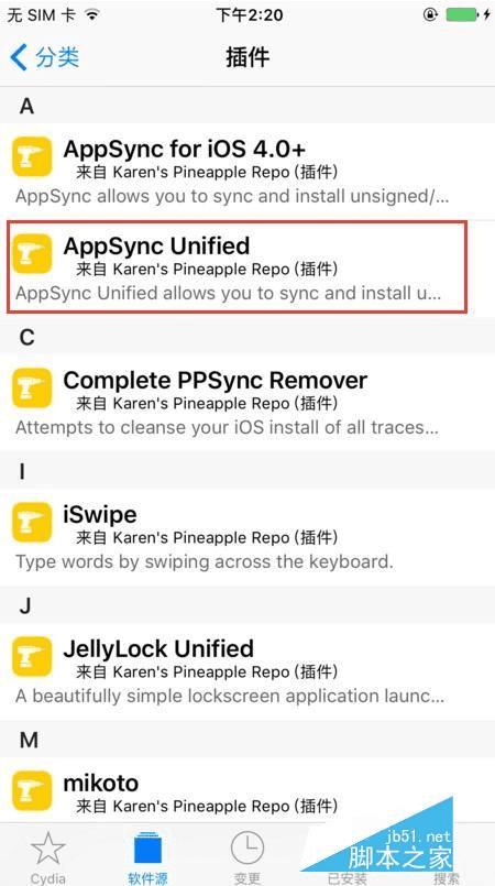 3、在源“Karen's Pineapple Repo”中点击“插件”,在插件列表就可以看到“AppSync Unified”;