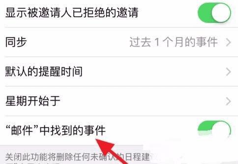 3、接着找到【设置】下的【日历】,拉到最下面,将【“邮件”中找到的事件】关闭