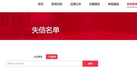 据悉,查询者进入“失信名单查询”页面后,可通过输入企业名称、社会统一信用代码或者人员身份证号码进行相关查询。
