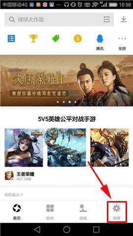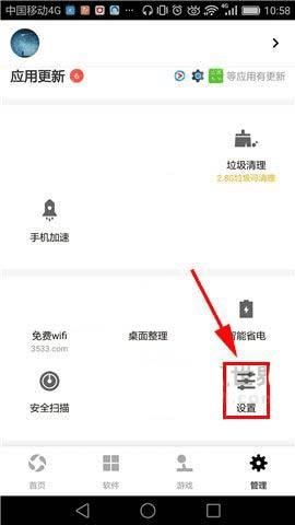 1)首先先打开熬应用宝】的界面,然后我们再点击右下角的【管理】,打开后接着点击【设置】。(如下图)