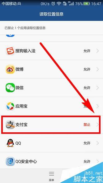 可以看到【支付宝】的权限状态是【禁止】,点击右边的箭头修改权限,步骤截图如下所示:
