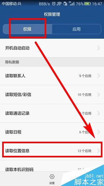 进入【权限设置】页面,在【权限】下找到【读取位置信息】,点击右边的箭头,步骤截图如下所示: