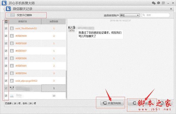 步骤四:进入微信聊天记录界面。在界面的左侧好友框内,我们发现显示橙色的微信好友。橙色好友代表的是已经删除的微信聊天记录的好友。然后勾选需要恢复微信聊天记录,点击【恢复到电脑】然后在进行查看。