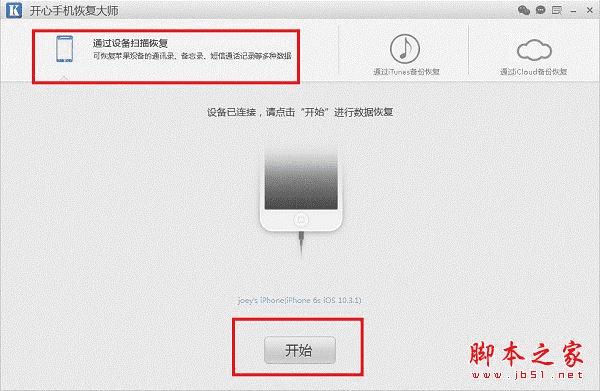 步骤二:下载结束后,运行软件。在界面上我们会发现三种数据恢复模式:通过设备扫描恢复,通过iTunes备份恢复,通过iCloud备份恢复。这里我们是要解决微信聊天记录恢复的问题,建议大家使用第一种数据恢复模式恢复,而且第一种模式是无需备份的。点击开始按钮,手机进入扫描状态。