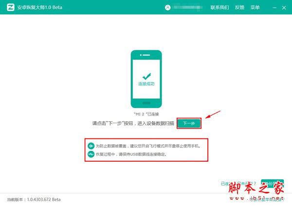 步骤二:安装结束后,连接手机到电脑上,运行安卓恢复大师软件。软件开始识别手机,识别手机完成后,点击下一步进入下个界面。注:安卓手机需已经root过,且开启了USB调试。