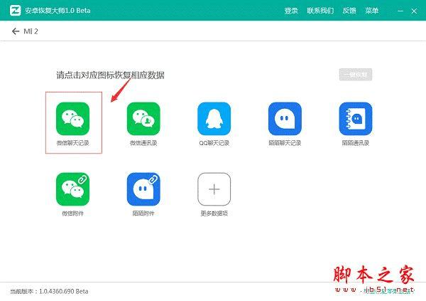 步骤三:扫描结束后,进入数据恢复的主界面。在这个界面上,有17种不同的数据项,我们可以使用开心手机恢复大师对他们进行数据恢复。点击【微信聊天记录】,进入扫描界面,扫描结束后进入下个界面。