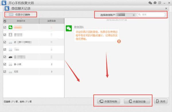 第四步:此时我们已经进入到了扫描阶段,等待扫描完毕,需要我们选择恢复的账号,选择完毕之后,就可以看到该账号下的微信数据。点击好友头像就可以看到与其的聊天记录,其中以橘黄色字体展示的就是我们之前删除的微信聊天记录,以黑色字体展示的是手机中仍然保留的微信聊天记录。此时只需要筛选出所需要的微信聊天记录,然后再点击【恢复到电脑】就可以将之前删除的记录恢复出来。
