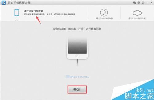 运行软件,我们点击选择“通过设备扫描恢复”,以此模式为例,教大家怎么恢复iPhone微信删除的好友。然后将苹果手机连接到电脑上,当软件识别到手机后,我们就可以直接点击界面下方的“开始”。