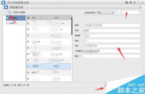 扫描完成之后,软件就会跳转到微信好友的预览界面了。包括已删除的微信好友和未删除的微信好友,都被扫描出来了,我们可以点击左上角的“仅显示已删除”查找到自己需要恢复的微信好友信息之后,可以根据信息来添加微信好友。当然也可以对应的方框中勾选,然后再点击下面的“恢复到电脑”按钮,就可以将这些微信好友信息保存电脑上了。