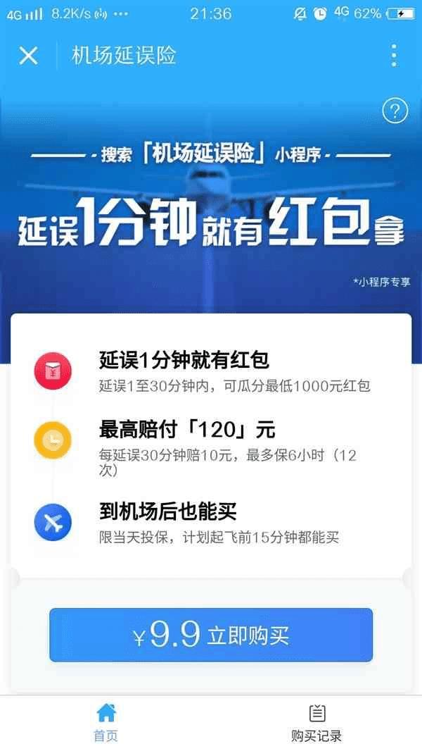 最近,众安保险推出了一款基于“附近的小程序”的延误险——机场延误险。用户可以通过此款小程序进行快速投保。只要是在航班计划起飞前15分钟,均可投保。延误1分钟也能拿红包,每延误30分钟赔付10元,最高可获得120元的赔付。