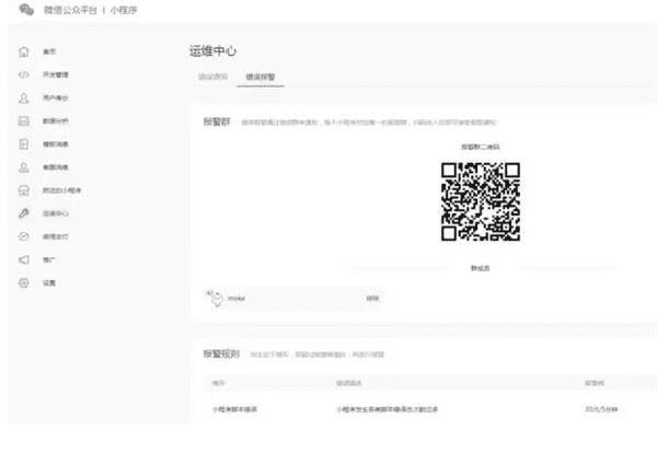 在运维中心,开发者还可扫描二维码加入小程序报警群。当小程序在运行中出现问题时,系统会推送信息告知报警群内的成员。