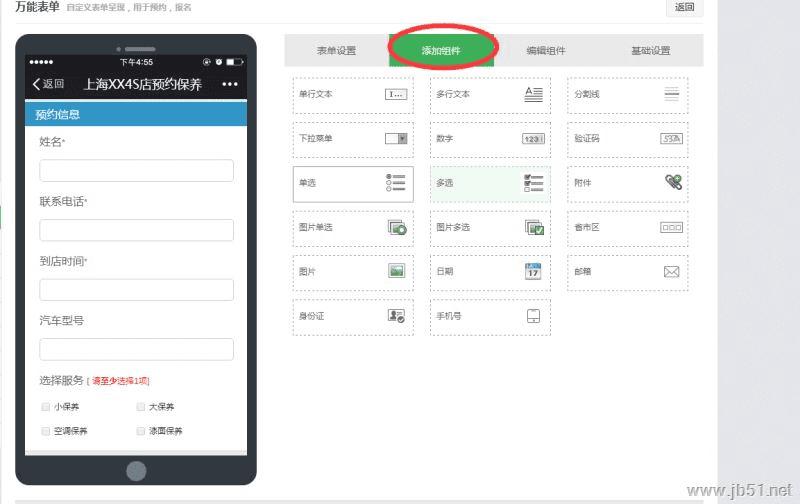 第四步:添加组件这一项,你需要粉丝提交什么类型的数据,就选择对应的类型,比如你需要填写姓名,那就选择单行文本,又可以对文本的属性进行编辑,做一些限制,同理如果要添加日期,那就点一下日期这个插件